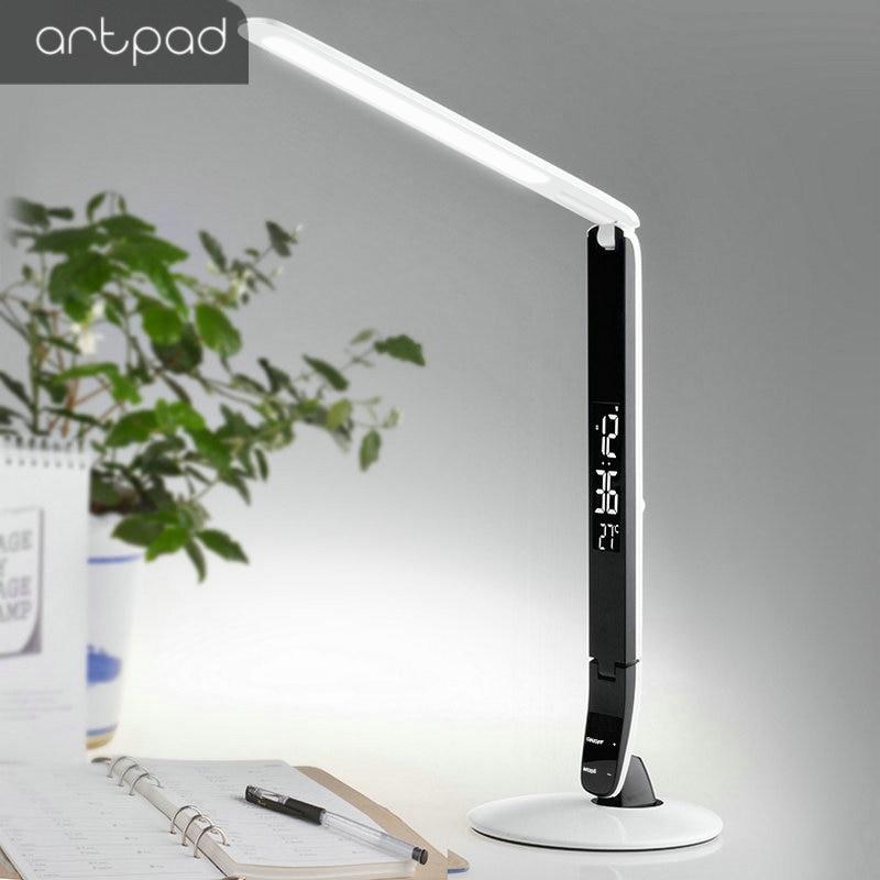 Шикарный 10 вт современный настольный светодиодный светильник с usb-портом, регулируемой складной конструкцией, часами, будильником, календарем и функцией отображения температуры. Отличная лампа для чтения. Лампа излучает белый свет (2800-6000 K), оснащена сенсорным управлением, питается от источника питания DC12V/1A.