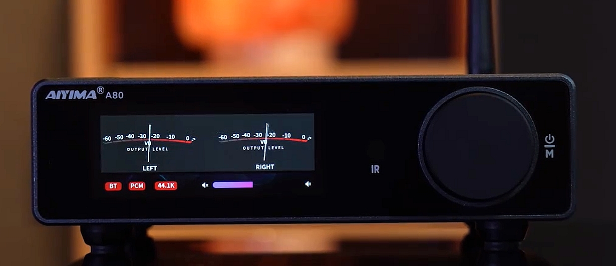 Далее, популярная модель от AIYIMA, которая помимо компактных размеров (155х123х41 мм) и полного комплекта цифровых входов привлекает внешним дизайном с большим цветным дисплеем. Экран может демонстрировать цифровые стрелочные индикаторы нескольких видов, и используется для упрощения настроек. Запас по мощности солидный — до 300 Вт на канал (усилитель на чипе TPA3255D2, регулировка громкости NJW1194). Помимо линейного есть балансный вход (TRS) и выход на активный саб.