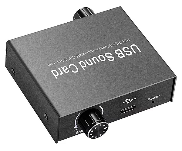 Вариант звуковой карты в металлическом корпусе (70,5х80.3х21,2 мм) с регулировкой громкости и низких частот. Входной интерфейс Type-C. Можно использовать свой кабель нужной длины. Крепкие металлические разъемы 3,5 мм. Но гарнитуры не поддерживаются.