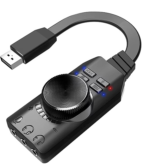 Звуковая карта размерами 73х35х24 мм со встроенным эквалайзером, удобной «крутилкой» громкости и даже Bluetooth (о котором не пишут даже на страничке товара, но он есть и работает на прием). Кабель короткий и плоский — около 6 см. Выходы типовые — 3 шт. 3,5 мм. Можно оперативно отключить микрофон.