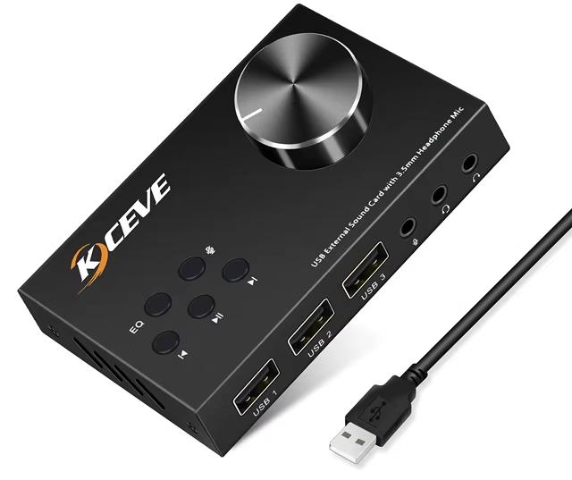 Завершает подборку вариант звуковой карты от KCEVE (она изображена на заглавном фото топика). Модель AM-U004 довольно универсальная — есть цифровые входы оптика и коаксиал (помимо USB), выходы не только на 3,5 мм, но и на RCA, удобная регулировка громкости и металлический корпус (10,2х6,5х2 см). Для нетребовательной к скорости порта периферии есть три порта USB 2,0. Работает с основными ОС без драйверов.