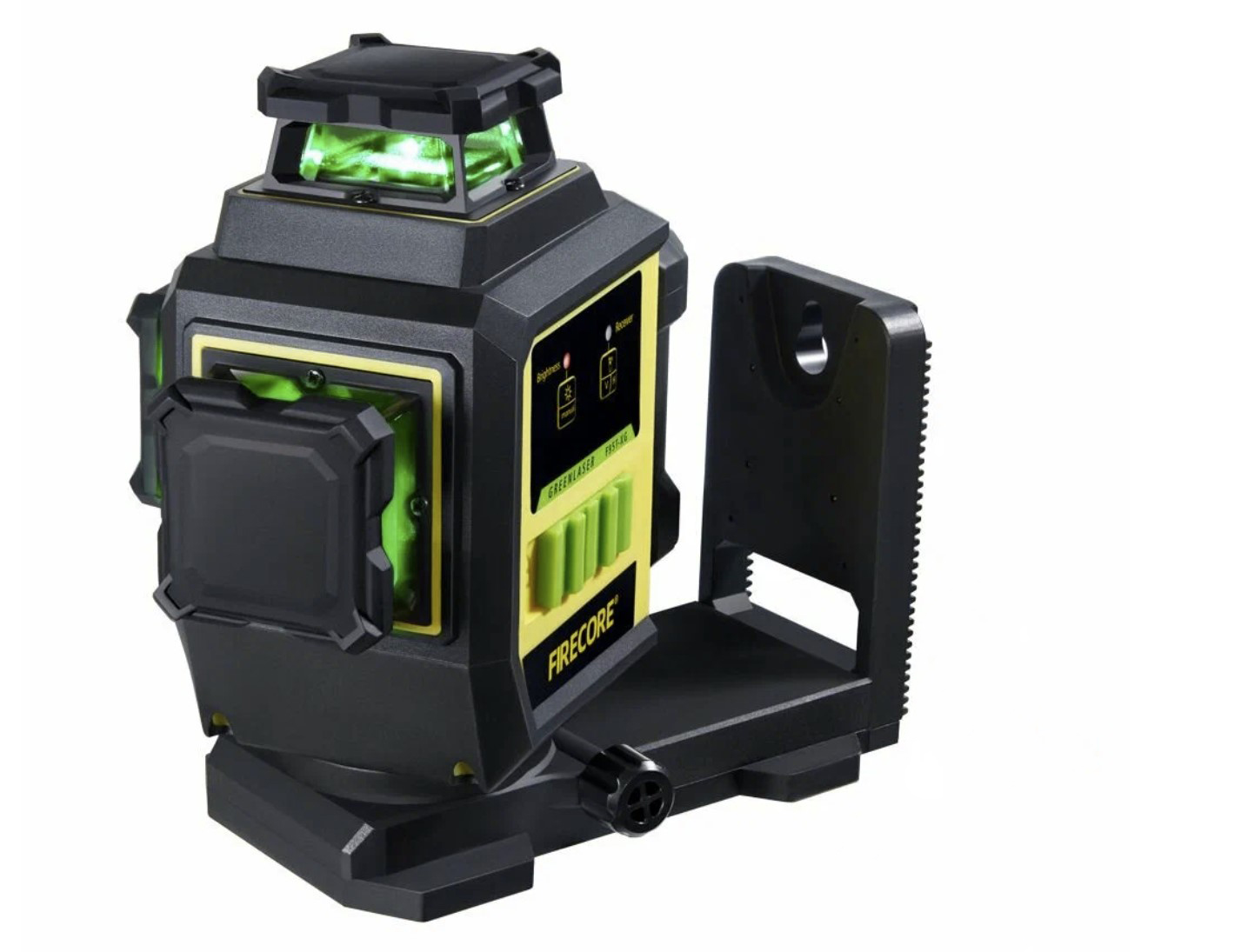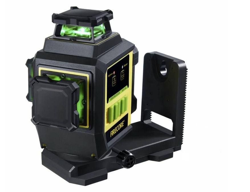 Лазерный уровень FIRECORE F95T-XG имеет нестандартную конструкцию. В комплекте с ним идёт несъёмный L-образный кронштейн с магнитами. Два вида резьбы — 1/4 и 5⁄8 — на кронштейне позволяют использовать широкий ассортимент штативов. Три лазерных излучателя могут создавать до 12 линий, угол развертывания которых составляет 360. Погрешность инструмента при построении составляет 3 мм на 10 м, а угол самовыравнивания — 4. Если отключить функцию самовыравнивания, этот инструмент можно использовать для проецирования наклонных линий. Аккумулятор, который используется в устройстве, — Li-Ion, ёмкостью 3000 мАч. Он обеспечивает до 6 часов работы без подзарядки. Если аккумулятор разрядится, его можно подключить к сети и продолжить использование.