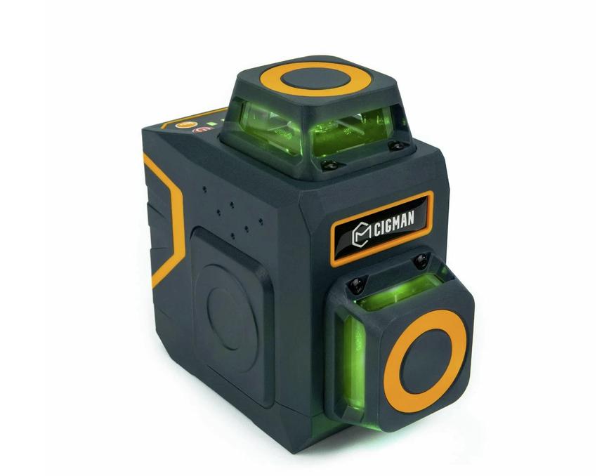 Cigman CM-701 — это компактный лазерный уровень с размерами 100 на 95 на 75 мм и весом 347 гр. Он работает от литий-ионного аккумулятора, ёмкостью 4 000 мАч. Одного заряда аккумулятора хватит на 30 ч работы, в зависимости от яркости лучей. Выбрать оптимальную яркость лучей можно из 4 предложенных режимов яркости. Во время работы нередки случаи, когда аккумулятор разряжается, в таком случае вы сможете подключить Cigman CM-701 к электро сети через комплектный кабель и продолжить работу. На штатив Cigman CM-701 устанавливается с помощью резьбы 1/4 дюйма. Для работы с напольными покрытиями в комплекте есть поворотное основание с микровинтом. В Cigman CM-701 предусмотрено три лазерных излучателя которые проецируют до 12 линий с полным углом обзора в 360 градусов. Если нужно построить наклонные линии, то имеется ручной режим, в котором блокируется маятник. Погрешность при построении составляет не более 0,3 мм/м, угол самовыравнивания составляет 5 градусов.