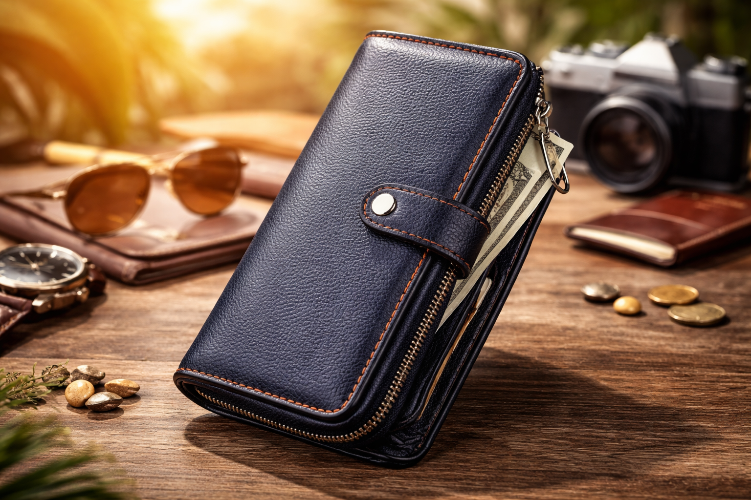 Подходит для хранения купюр, банковских карт и монет. Закрывается на молнию. Стиль — винтажный, поверхность однотонная, без выраженных декоративных элементов.