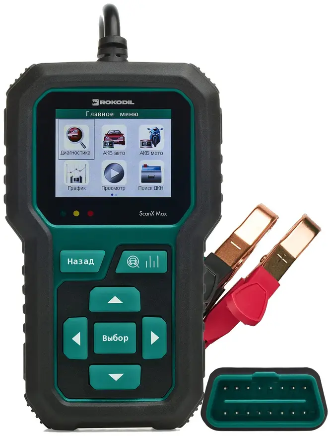 Открывает подборку мультимарочный сканер для автомобильной диагностики с цветным дисплеем 2.4″ ScanX Max от компании Rokodil. Данная модель работает как 2-в-1: диагностический сканер (для авто от 1996 года выпуска) и тестер автомобильных аккумуляторов (аккумулятор в возрасте несколько лет часто может подвести автомобилиста, особенно зимой).