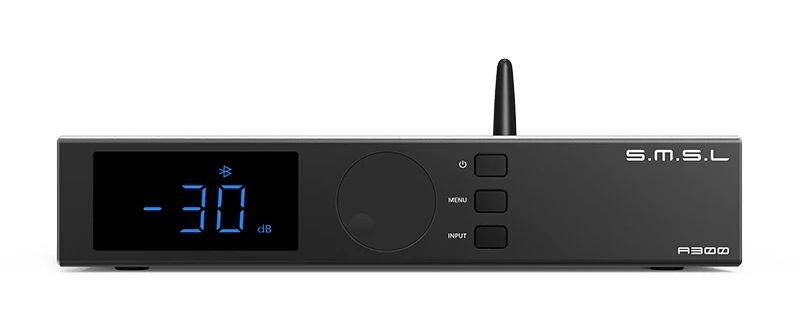 Открывает список настольный усилитель мощности от компании SMSL с сертификацией Hi-Res. Модель A300 с мощностью 165 Вт на нагрузку 4 Ом построена на чипе Merus от Infineon, регулировка громкости цифровая (NJW1194). Отношение С/Ш 103 дБ. Есть возможность подключить активный сабвуфер. Входы сигнала: линейный (2 шт. на RCA), мостовой (BTL), беспроводной Bluetooth 5.0, USB порт для носителей файлов и подключения к ноутбуку/ПК. Есть цифровой темброблок.