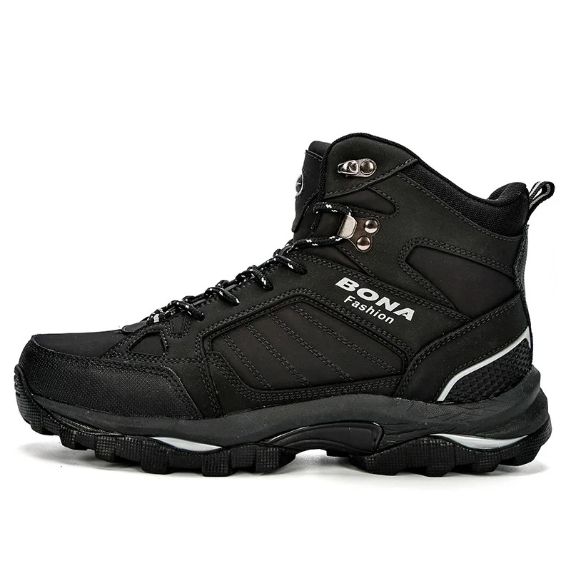 Дополнительные характеристики: водостойкий прочный материал, защитные нашивки, в том числе на пятке, прочные двойные швы, металлические элементы шнуровки, отличный протектор.