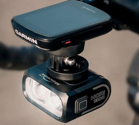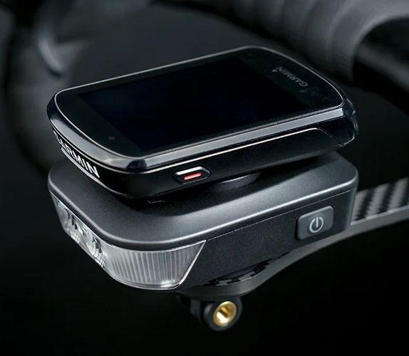Фонарь FR500 выдает до 600 люмен светового потока (6 режимов) и имеет конструкцию с двумя байонетными креплениями Garmin сверху и снизу плоского корпуса. Можно на одностороннее выносное крепление повесить такую фару, а на нее сверху велокомпьютер. Такой «бутерброт» по вертикали занимает меньше места, и экран велокомпьютера находится по направлению взгляда.