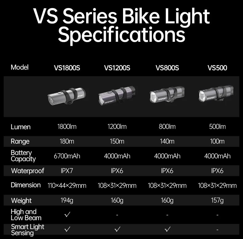 Открывает список передние фары серии VS от китайского бренда iGPSPORT. В лоте 4 модели с максимальным световым потоком от 500 до 1800 люмен (луч шириной 220 градусов). Индекс S в название показывает улучшенное светораспределение с более четкой свето-теневой границей (что не ослеплять встречный транспорт).