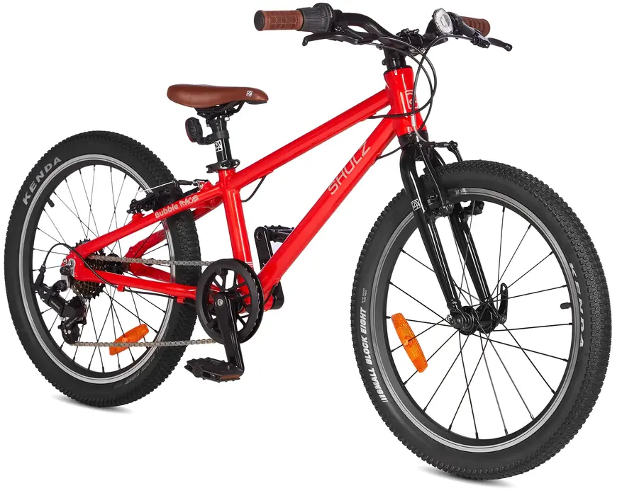 К характеристикам Bubble и Chloe. Вилка и рама — алюминий, вес 8,3 кг, то есть на 1-2 кг легче большинства алюминиевых альтернатив, не говоря от 12+ кг стальных тяжеловесах. Установлены фирменные покрышки KENDA Small block 8 20х2,1″. Это мега-популярная модель на взрослых, в том числе экстремальных велосипедах. Честно говоря, был слегка удивлен такому на детской-подростковой модели. Протектор с одной стороны позволяет особо не терять накат на плоской поверхности, но и хорошо держит всякие лесные тропинки.