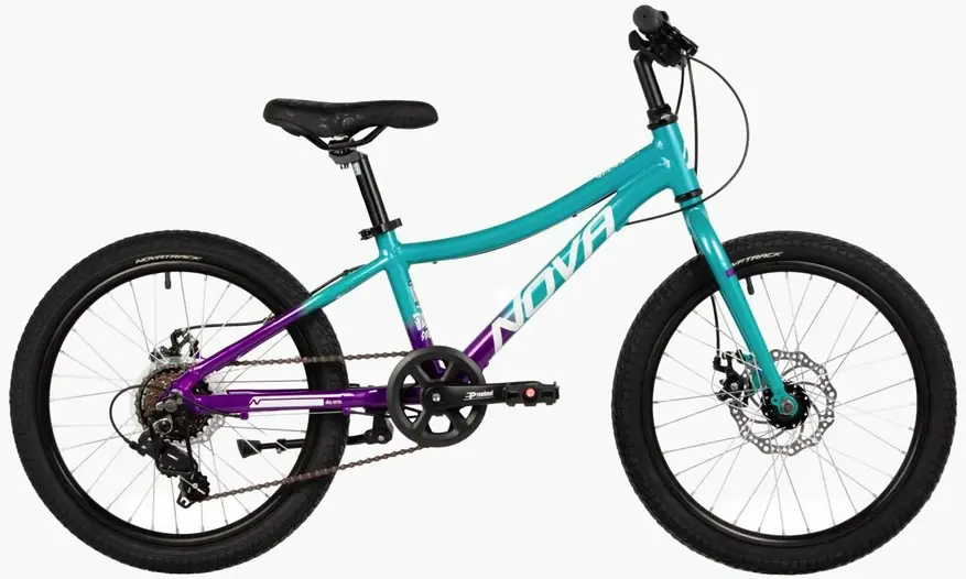 В этом году для мальчиков нам предлагают Novatrack Extreme Disc 20″, а для девочек Novatrack Katrina Disc 20″. Отличия помимо расцветки заключаются в раме, хотя визуально они микроскопические — просто верхняя труба рамы у Katrina чуть меньше скошена. А вот гораздо более заметная разница — у Extreme Disc установлена амортизационная вилка с ходом 40 мм, также скоростей — не шесть как у Katrina, а семь. Зато «Екатерина» может похвастаться версией как с дисковыми, так и клещевыми тормозами — последняя позволит немного сэкономить.