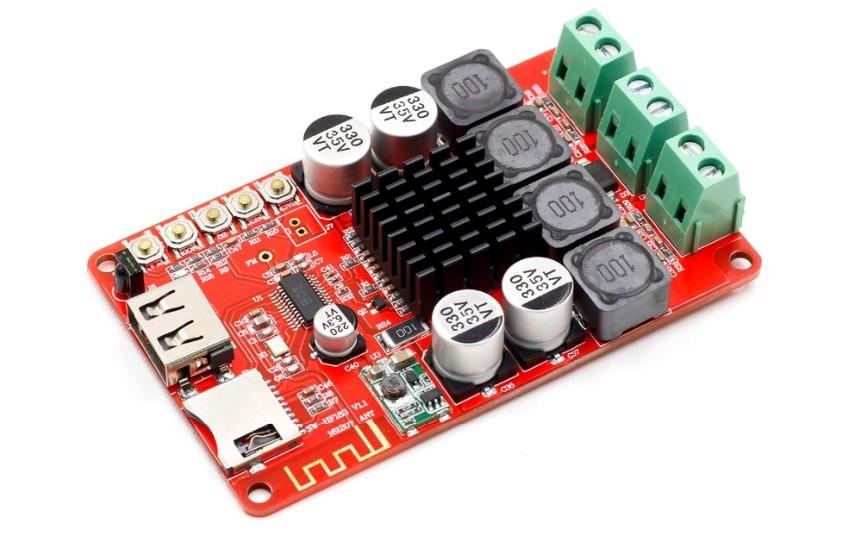 Плата обеспечивает выход до 100 Вт в сумме на два канала. Питается от 8..26 В. Есть возможность проигрывания с карты памяти MicroSD и пульт ДУ в комплекте.