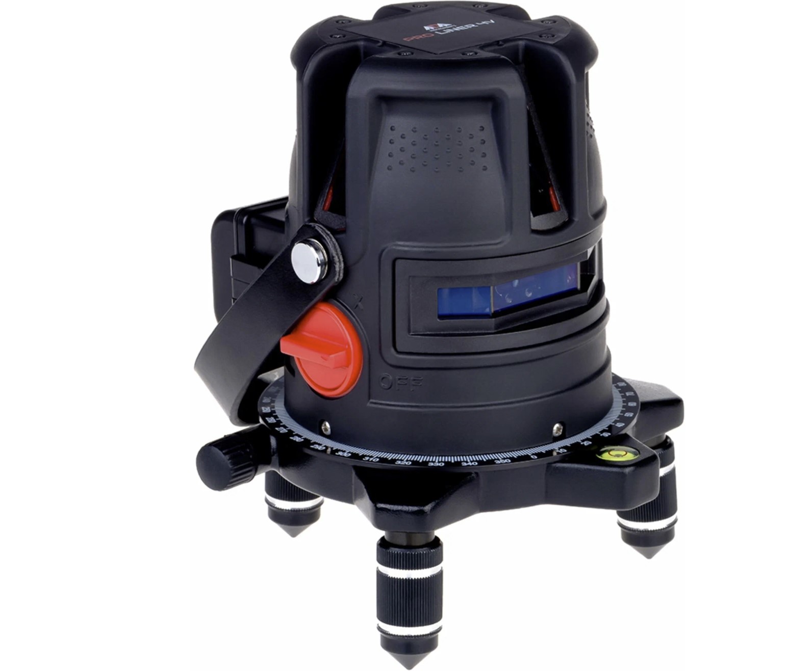Цвет лазера — красный, из-за чего разметка может плохо различаться при солнечном свете или просто ярком освещении. Чтобы компенсировать это, производитель предусмотрел комплектные лазерные очки, позволяющие лучше рассмотреть красные линии в условиях яркого света. Строительный уровень работает не только от батареек типа АА, но и от зарядного устройства. Это поможет продолжить работу, даже если невовремя сели батарейки. Поворотное основание с встроенной градусной шкалой обеспечит контроль угла разворота и облегчит наведение вертикальной линии. Сам корпус громоздкий и тяжелый (1,6 кг), однако он прочный, сборка и качество материалов отличаются надежностью. Гарантия на модель действует в течение 1 года.