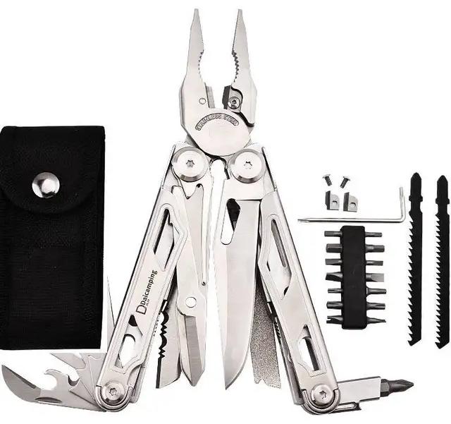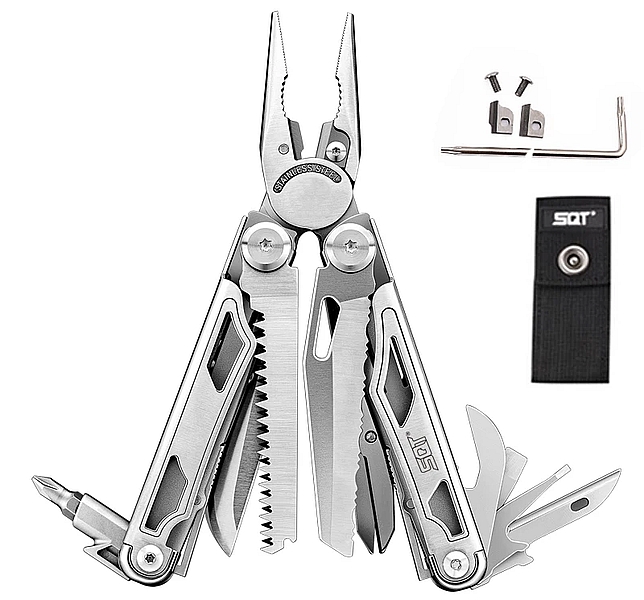 Нельзя обойти стороной одну из самых продаваемых моделей карманных мультитулов с пассатижами на AliExpress.ru. Плюсы этой модели очевидны: 1. доступная цена и много отзывов. 2. модульность по сменным лезвиям и пилками. 3. Широкая комплектация с битами (7 шт.), чехлом для ношения, пилками и сменными губками. 4. Прочность конструкции (у пассатижей сталь 3Cr13 с закалкой до 55HRC), выдерживает нагрузку на скручивание 130 кг. Из минусов — высокая масса (0,4 кг).