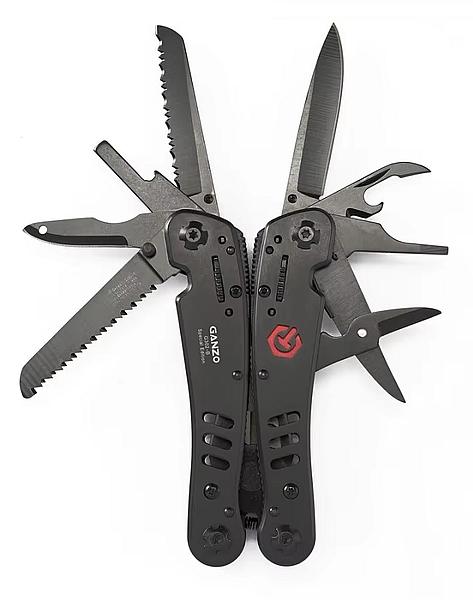 Неустаревающая классика — мультитул с набором сменных бит от Ganzo. Всего 26 функций. У меня такая модель служит уже довольно давно, пассатижи целы, люфтов не появилось (там металлическая фиксация положения инструментов), набор из 10 бит неплохой, но нож подтачивал. Ну и не самый легкий вариант (если брать в походы) — 280 г. (под 400 с чехлом).