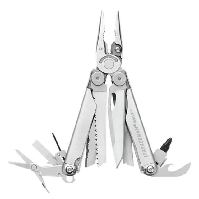 У инструмента Wave Plus 18 функций, включая пассатижи со сменными (на винтах) лезвиями. Нож (лезвие 7,4 см) открывается без полного раскладывания инструмента. Выполнен мультитул из нержавеющей стали 420, пассатижи из 154CM, есть фиксация частей в рабочем положении. Размеры (сложен) 10х3 см, масса 241 г.