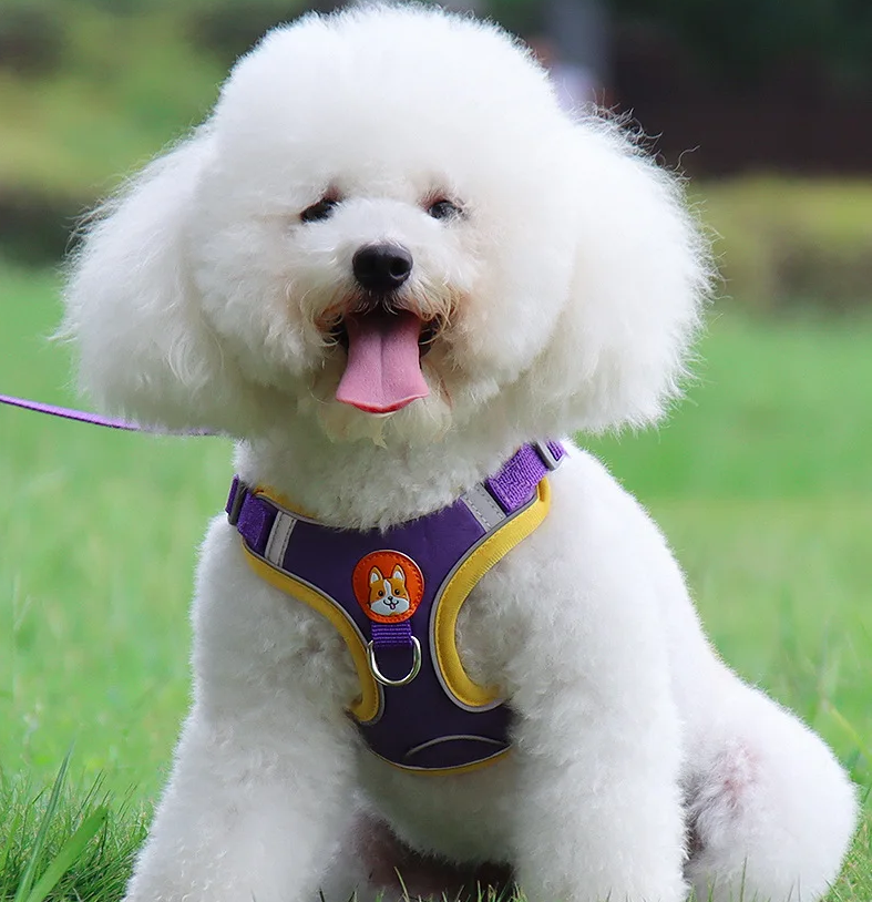 Комплект из полиэстера для маленьких и средних собак. Шлейка регулируется по шее и груди, фиксируется пряжками быстрого открытия. Основа — дышащая сетка с мягкими накладками. По ремням проходят светоотражающие нити. Предусмотрены два металлических крючка: спереди для контроля, сзади для обычных прогулок. Размеры: S 2-4 кг, M 3,5-5,5 кг, L 5-7,5 кг, XL 7,5-10 кг. Подходит чихуахуа, корги, мопсам, французским бульдогам и другим мелким породам. Доступно 6 расцветок: синий, красный, серый, кофейный, розово-красный, голубой. В комплекте: шлейка и поводок 1,5 м.