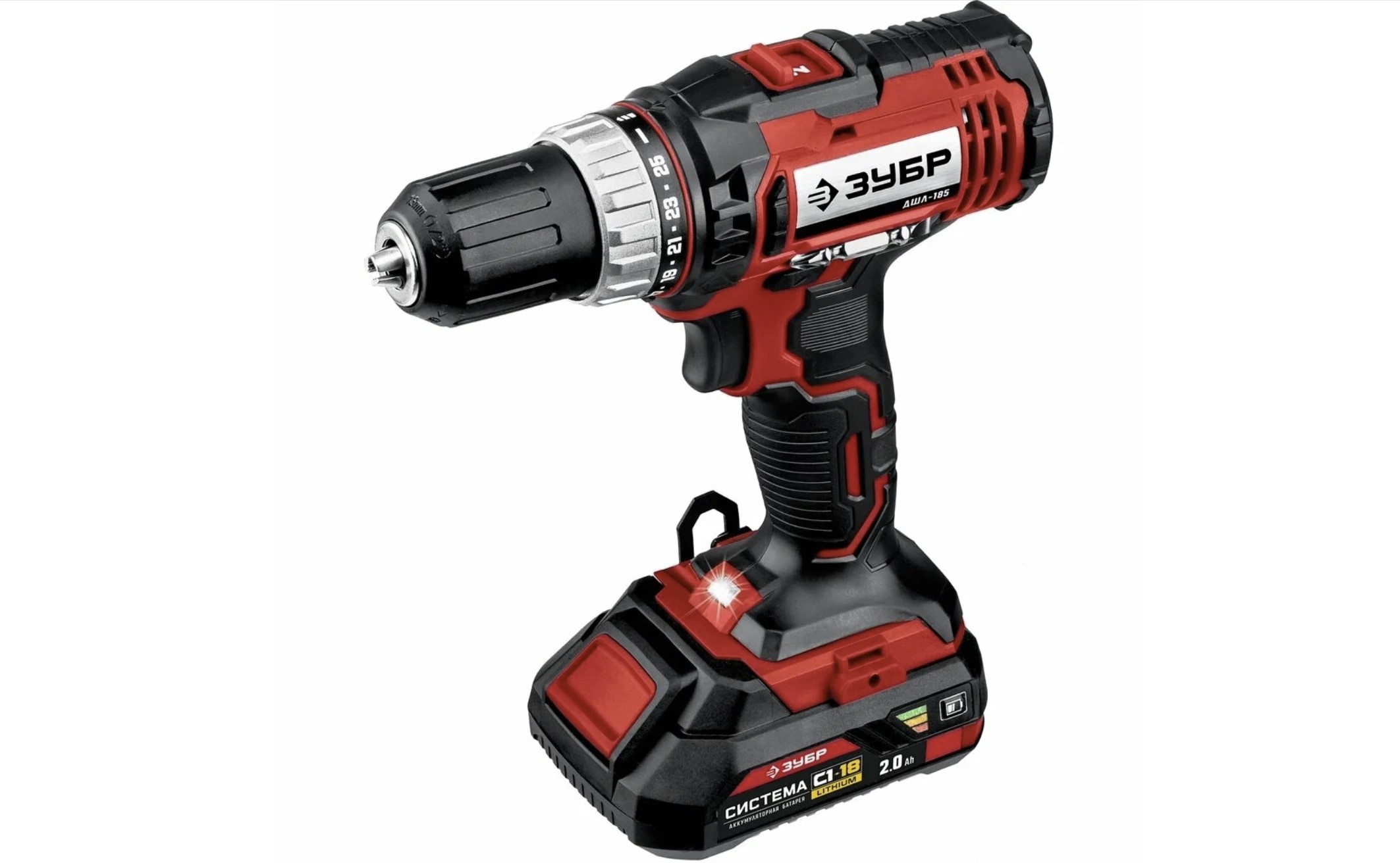 Питается инструмент от слайдерного аккумулятора С1-18В с напряжением 18 В. Максимальный крутящий момент шуруповёрта составляет 40 Нм, а количество ступеней крутящего момента — 25+1.
