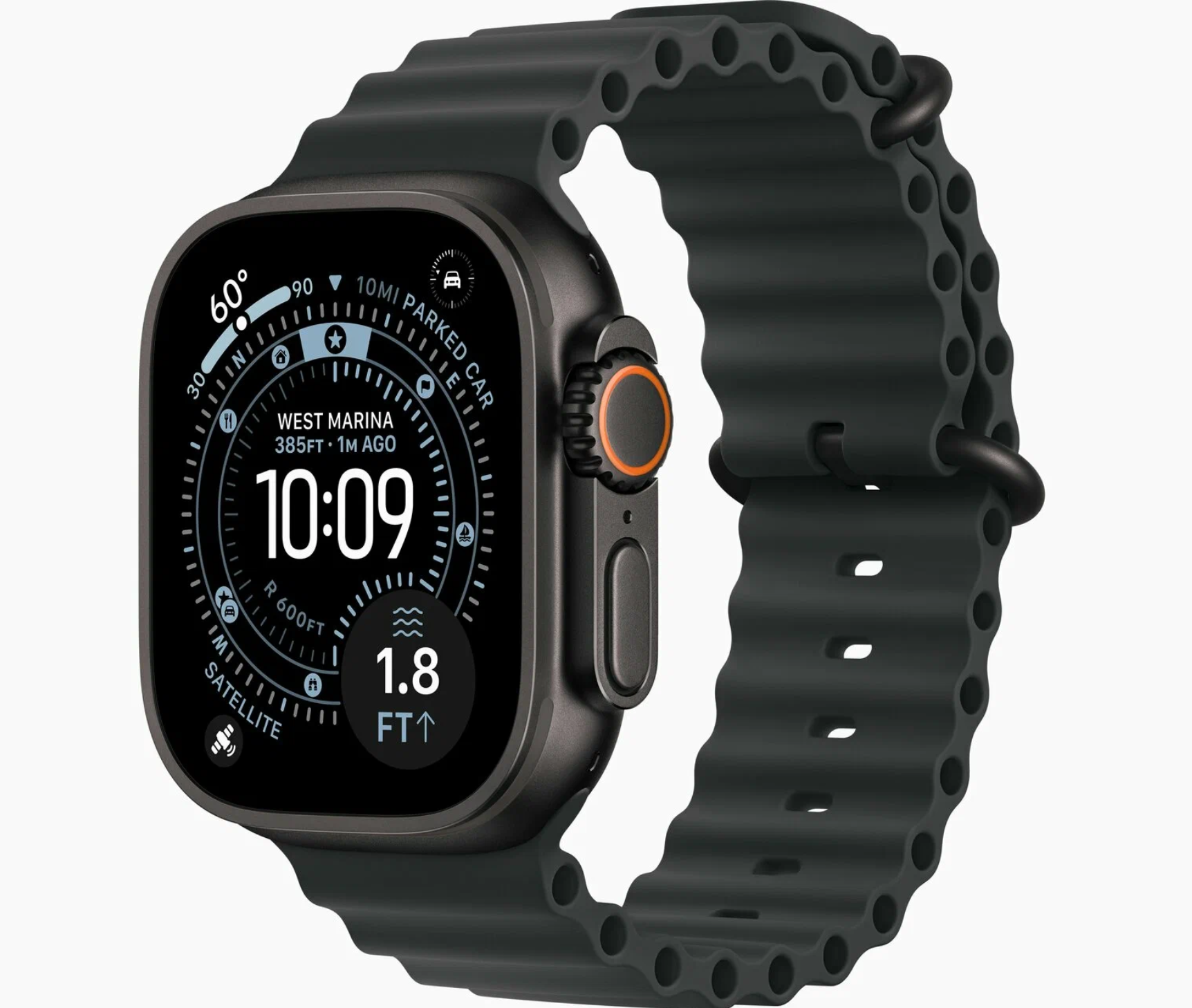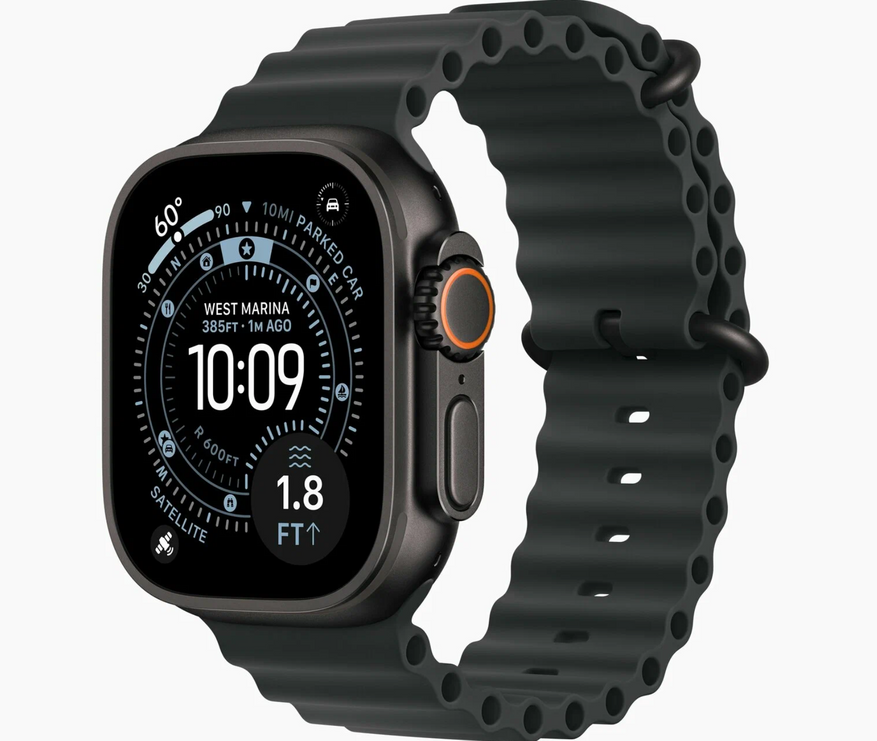 Завершим сегодняшний список моделью Apple Watch Ultra, которая выбивается из общего списка своим форм-фактором. В основе — прочный титановый корпус с сапфировым стеклом, обеспечивающий водонепроницаемость до 100 метров и защиту от пыли. Яркий 49-мм OLED-дисплей с максимальной подсветкой 3000 нит остаётся читаемым даже под палящим солнцем.