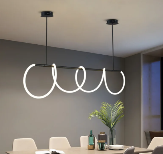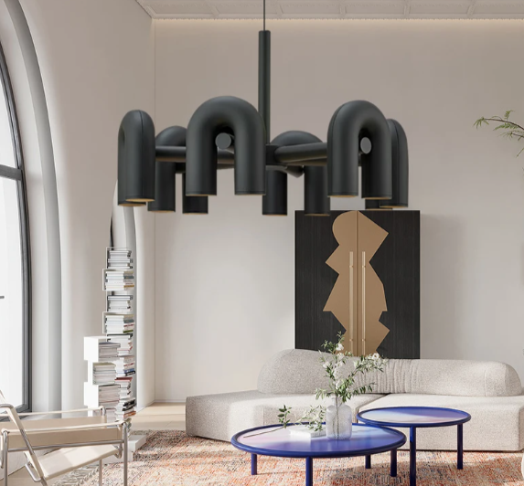 Потолочная люстра выполнена в скандинавском стиле с U-образной формой, что придаёт ей современный и минималистичный вид. Корпус изделия изготовлен из прозонового материала, обеспечивающего лёгкость конструкции и устойчивость к воздействию окружающей среды.