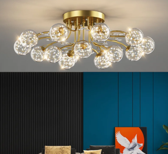 Конструкция состоит из 15 стеклянных шаров, обеспечивающих равномерное освещение. Корпус отделан полированным хромом.