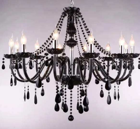Хрустальная люстра выполнена в чёрном цвете и относится к категории современных канделябров. Монтаж осуществляется близко к потолку, что делает её подходящей для помещений с невысокими потолками. Источник питания — переменный ток в диапазоне напряжения от 90 до 260 В.