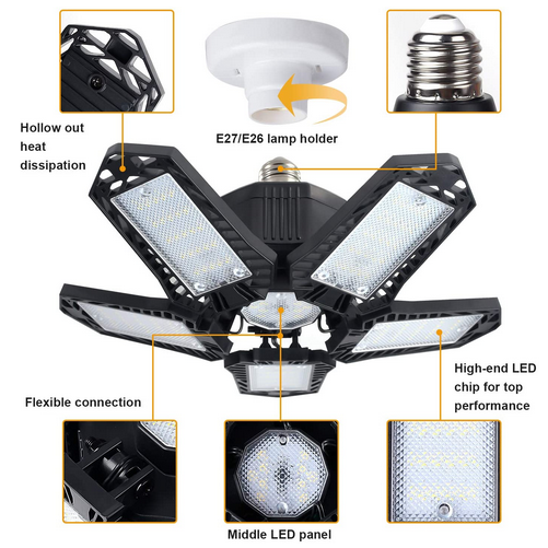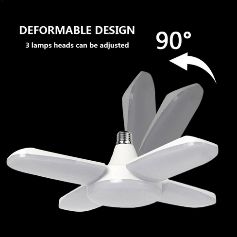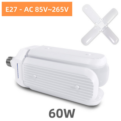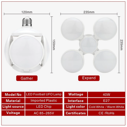 На выбор доступна мощность 60 или 80 Вт, а также тёплый (3000K) или нейтрально белый свет (6500K). Лампа крепится в цоколь Е27 и имеет следующие размеры: 120х350мм в раскрытом состоянии и 100х110мм в сложенном.