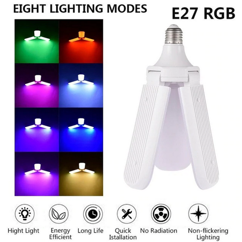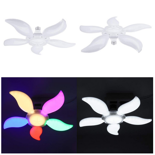 Данная лампа светит пятью разными цветами одновременно с мощностью 75 Вт. Вкручивается в цоколь Е27, имеет 140 светодиодов (чип 2835), лепестки поднимаются. Размеры в разложенном положении: 38х38х10 см, а в сложенном — 13x13x16,5 см. Ещё есть такая же лампа, светодиоды которой светят одним цветом (температура 6500K).