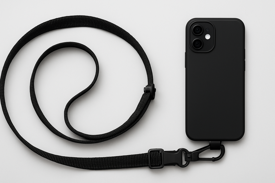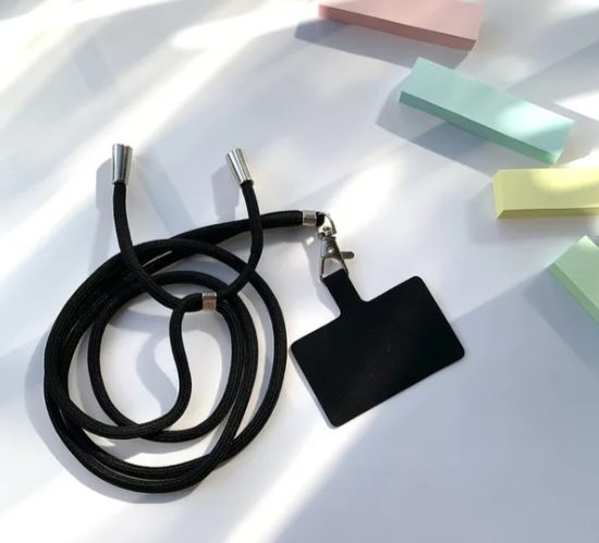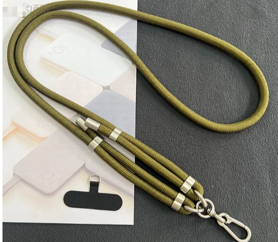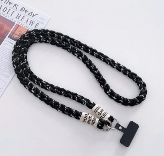 Шнур изготовлен из плотного нейлона, а металлические элементы обеспечивают надёжную фиксацию. Подвесная верёвка выглядит прочной и подходит не только для телефона — её можно использовать для подвешивания небольших предметов, например, фонарика или LED-лампы.