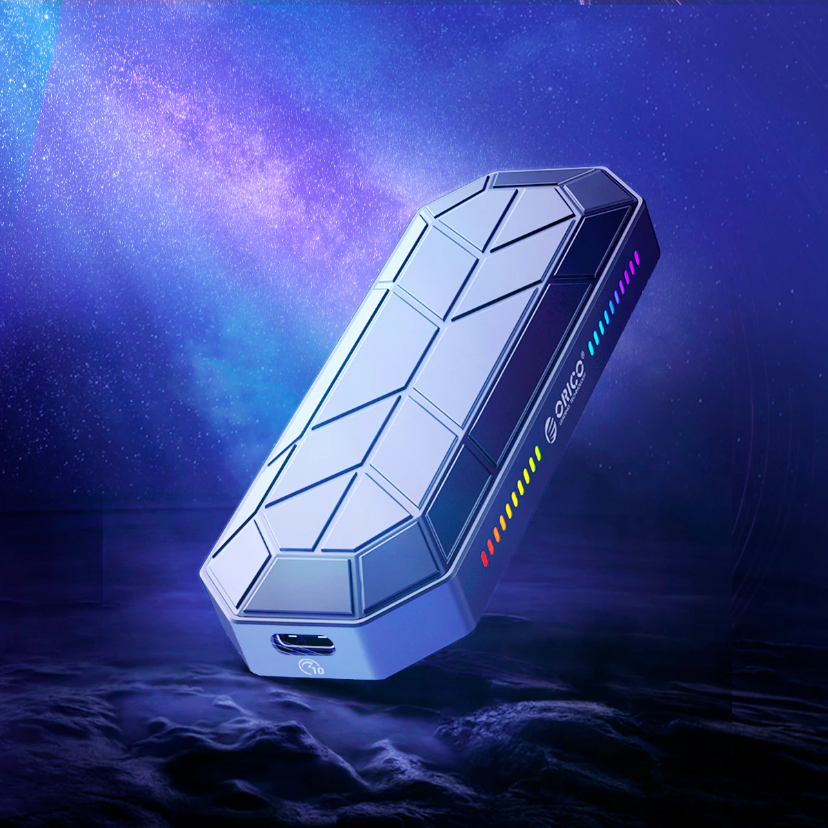 Внешний SSD-накопитель Orico с объемом памяти 256-1Тб и скоростью 940Мб/с. Алюминиевый корпус имеет RGB-подсветку и анимацию при работе. Высокая скорость работы обеспечивается благодаря интерфейсу USB 3.1 gen 2. Габариты корпуса: 109*40*14 мм.