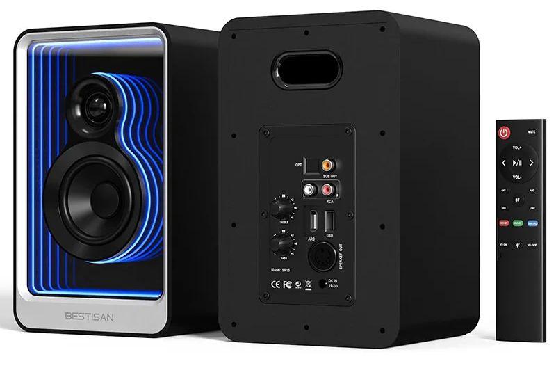 Активная акустика с необычным видом передней панели (там зеркальная часть и управляемая подсветка RGB) от Bestisan. Мощность 40 Вт (RMS). Излучатели: 1,25″ ВЧ с шелковым куполом + 3″ СЧ/НЧ.