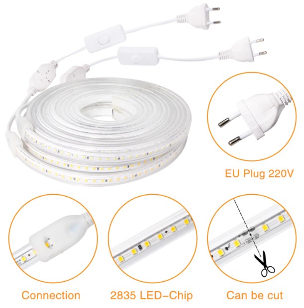 Для организации дополнительного освещения на кухне или в других местах в доме можно использовать светодиодную ленту. Я предлагаю рассмотреть данный вариант с питанием от бытовой электросети. Светильник комплектуется выключателем, а при заказе можно выбрать цвет свечения и длину ленты от 1 до 20 метров. Также стоит отметить, что если лента длине, чем вам нужно, ее можно укоротить. Немаловажным также является наличие защитной оболочки, которая защитит светодиоды от внешнего воздействия и от случайных повреждений.