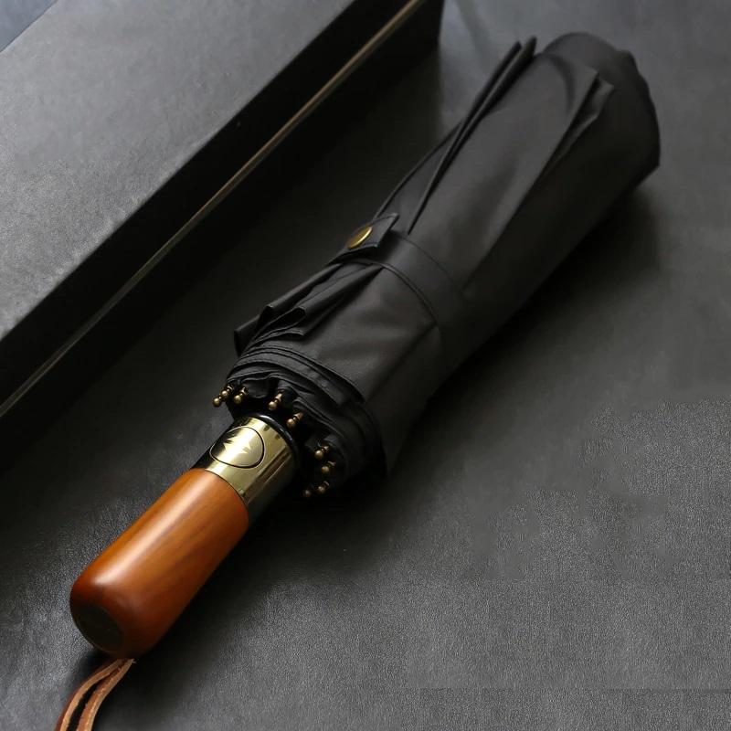 Интересный классический зонт с деревянной ручкой, смотрится дорого и добротно. Продается вместе со стильным футляром для хранения (на молнии). Зонт представлен в трех цветовых вариациях, мне, конечно, симпатизирует классический черный, но на фото отлично смотрится и в синем, и сером цвете. Компактный 32 см в сложенном виде, нетяжелый всего 483 грамма, он спокойно уместится в мужской сумке. 10 ребер и плотная ткань, а также механизм — полный автомат и удобная для захвата рукоятка, длиной 7 см, призваны сделать его более долговечный и износостойким и удобным для пользователя.