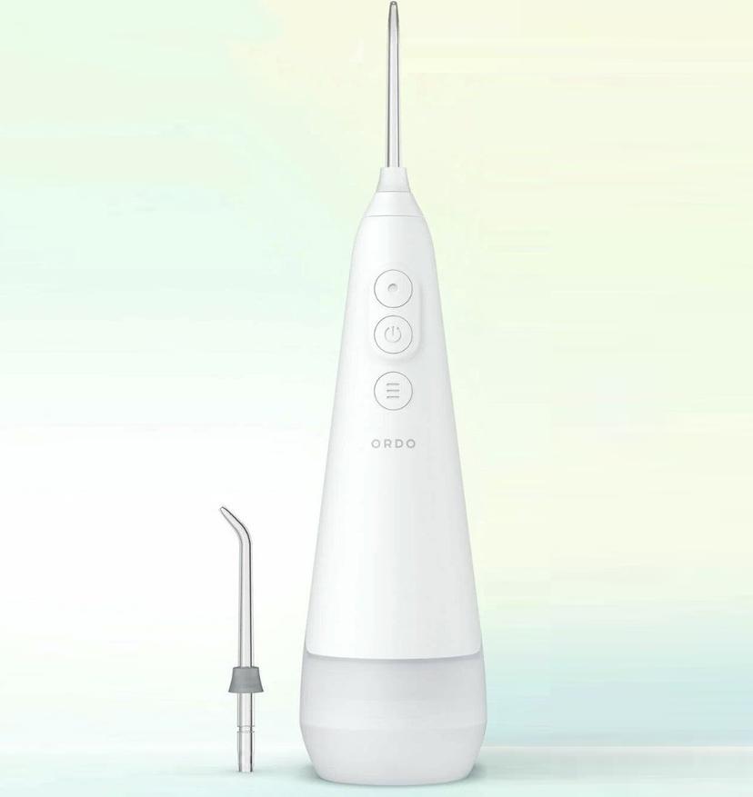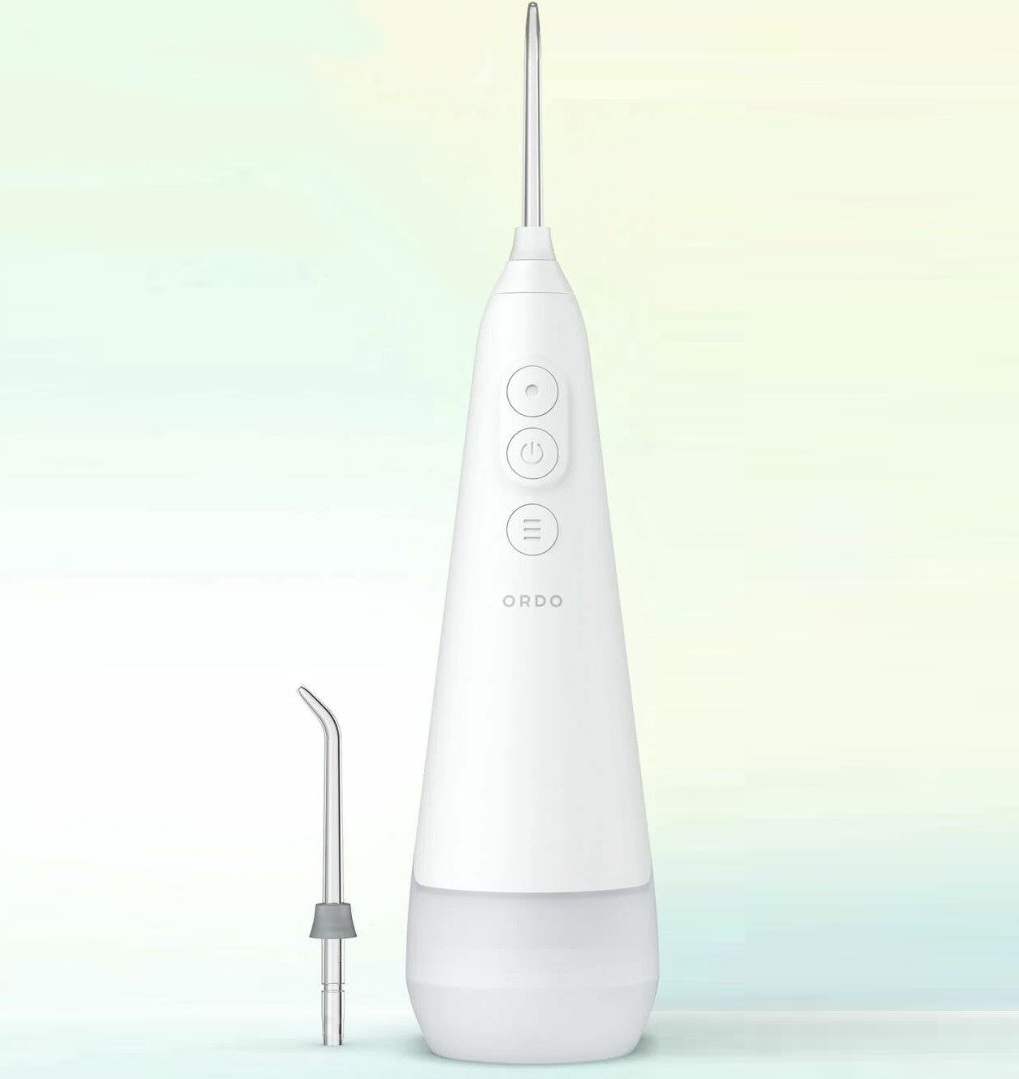 Элегантный портативный ирригатор от бренда ORDO — речь идет про модель Hydro Sonic в белом цвете и с парой насадок в комплекте. Стоит отметить удобное расположение индикации на верхней части корпуса — она обращена к пользователю. Хранение насадок выполнено достаточно необычным способом — внутри корпуса. Доступ к насадкам открывается при съеме колбы.