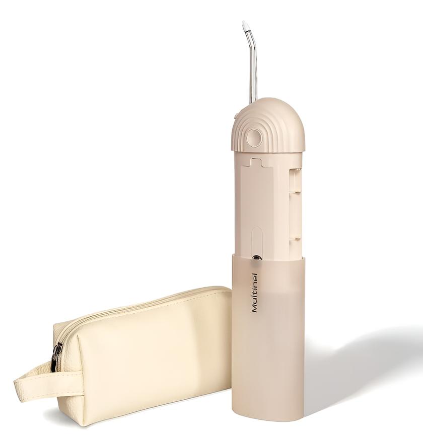 Начну подборку с портативной модели Jetsy Fold&Go от бренда Multinel. Следует выделить оригинальную складную конструкцию корпуса, которая позволяет компактно хранить не только сам ирригатор, но и набор насадок в небольшом мягком кейсе из комплекта. Такой вариант вполне подходит для путешественников — весь набор занимает минимум места в сумке или чемодане. Особенность корпуса в том, что резервуар для воды складывается, уменьшая размер ирригатора в 2 раза (примерно до размеров зубной щетки в футляре). В этой версии комплектации поставляется сразу три разных насадки: базовая (для освежения и чистки), ортодонтическая (очистка между зубов, коронок и брекетов), а также пародонтологическая с тонкой струёй (массаж и удаление зубного налета). Отмечу, что комплект сменных насадок можно приобрести отдельно. Пользователь может подстроить режим работы по своим предпочтениям (стандартный, мягкий, с выбором скорости в каждом) или выбрать импульсный режим работы. Подзарядить можно от USB-C, в том числе и от компьютерного/ноутбучного разъема или от зарядки для смартфона.