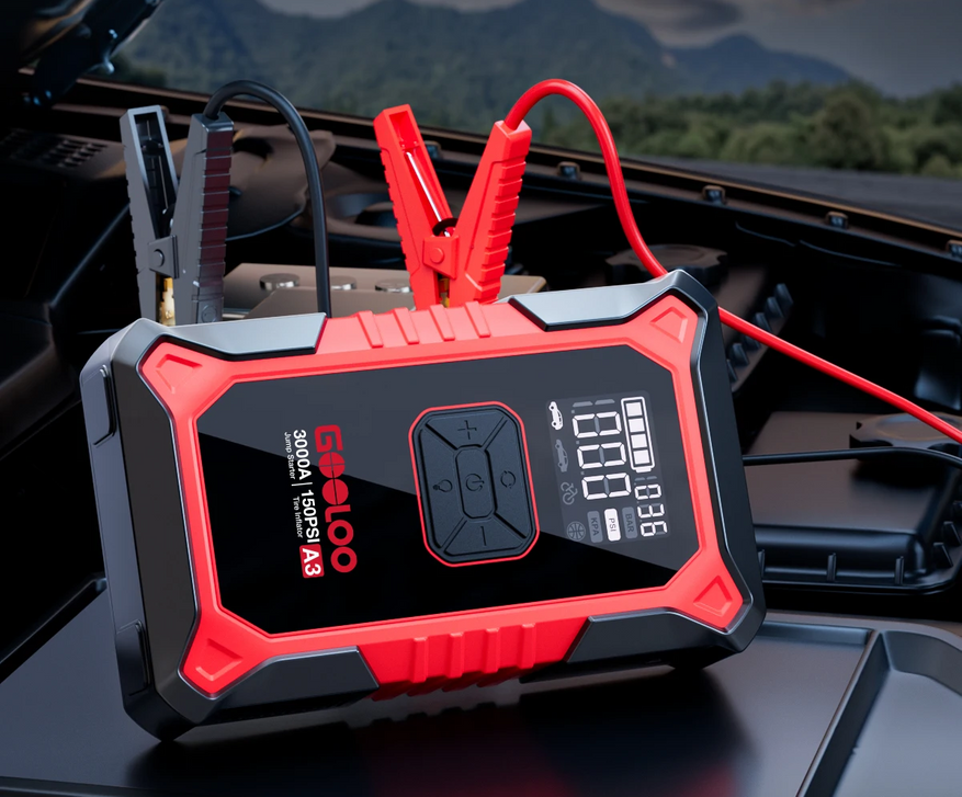 GOOLOO A3 сочетает функции автомобильного стартера и компрессора, рассчитан на бензиновые двигатели до 9 л и дизельные до 6,5 л. Пиковый ток — 3000 А, рабочий — 400 А. Аккумулятор 12 000 мА·ч (44,4 Вт·ч) поддерживает до 1000 циклов зарядки. Компрессор обеспечивает давление до 150 PSI, накачивает шины до 36 PSI менее чем за 7 минут с автоматическим отключением. Два USB-порта (5 В/2 А и 5 В/2,4 А) для зарядки гаджетов. Светодиодный фонарь 100 лм с режимами освещения и SOS. Рабочий диапазон температур −20…+60 °C, вес — 1 кг, сертификации CE, FCC, UL, RoHS, KC.