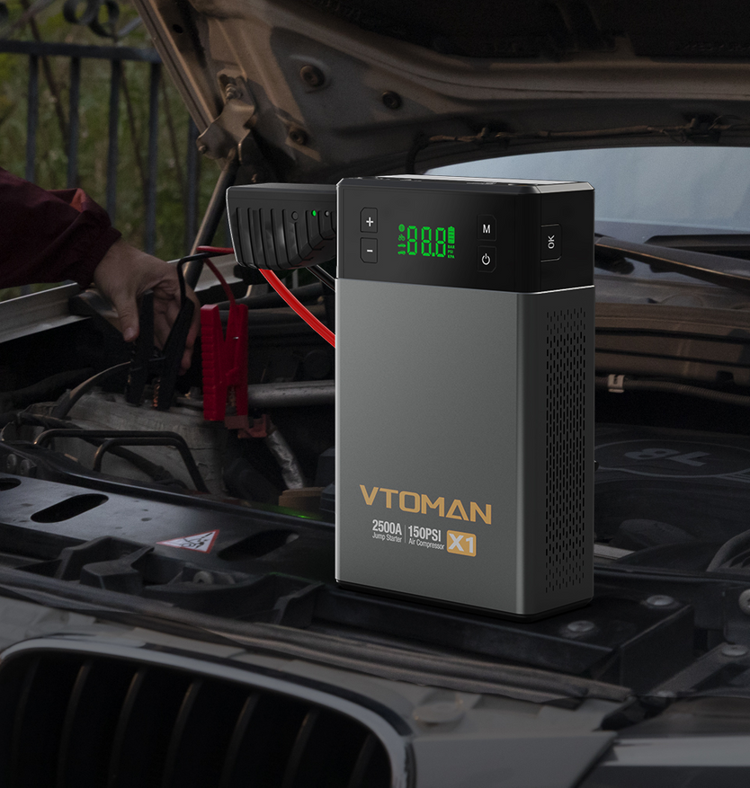 VTOMAN VX1 оснащён аккумулятором 12 000-18 000 мА·ч, пиковый ток 2500 А, запускает бензиновые двигатели до 8,5 л, дизельные до 6 л. Воздушный компрессор 150 PSI, поток 45 л/мин, цифровой дисплей с автоматическим отключением при достижении давления. Power Bank USB-C 5 В/2 А, USB-A 5 В/2,4 А, постоянный выход 15 В/10 А. Светодиодный фонарь 400 лм с режимами постоянный свет, стробоскоп, SOS. Рабочий диапазон −20…+60 °C, ресурс более 1000 циклов.