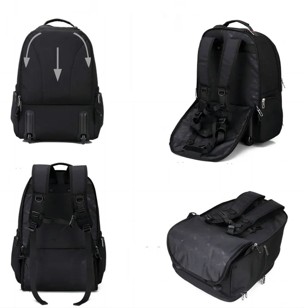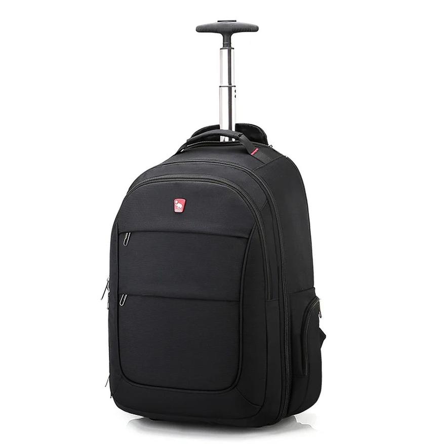 Рюкзак на колесиках с телескопической рукояткой — это удобный гибрид рюкзака и чемодана, сочетающий преимущества обоих видов багажа. Он идеально подходит для путешествий, школьных и деловых поездок благодаря своей многофункциональности. Два колеса на жестком основании и телескопическая ручка позволяют катить рюкзак за собой, снижая нагрузку на спину и плечи. Выполнен из полиэстера, с усиленными швами. Вместимость сопоставляет 29 литров, помещается ноут размером до 15,6 дюймов. Для командировок оснащен внутренним отделением с резиновыми ремнями для рубашек. Совсем недорогой.