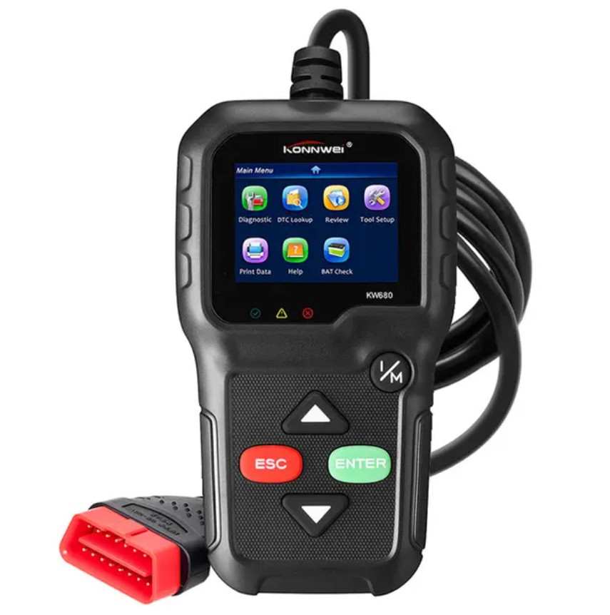 Классическим примером автономного диагностического сканера для проверки автомобиля может служить модель KW680 от фирмы Konnwei. Это простой мультимарочный автосканер с дисплеем и встроенной базой данных, которая позволяет проверять коды ошибок. Такая модель дает возможность выполнить диагностику основных систем своими руками, а затем — сбросить ошибки. К слову, у меня имеется в бардачке похожий автосканер — можете посмотреть обзор с рекомендациями по использованию.