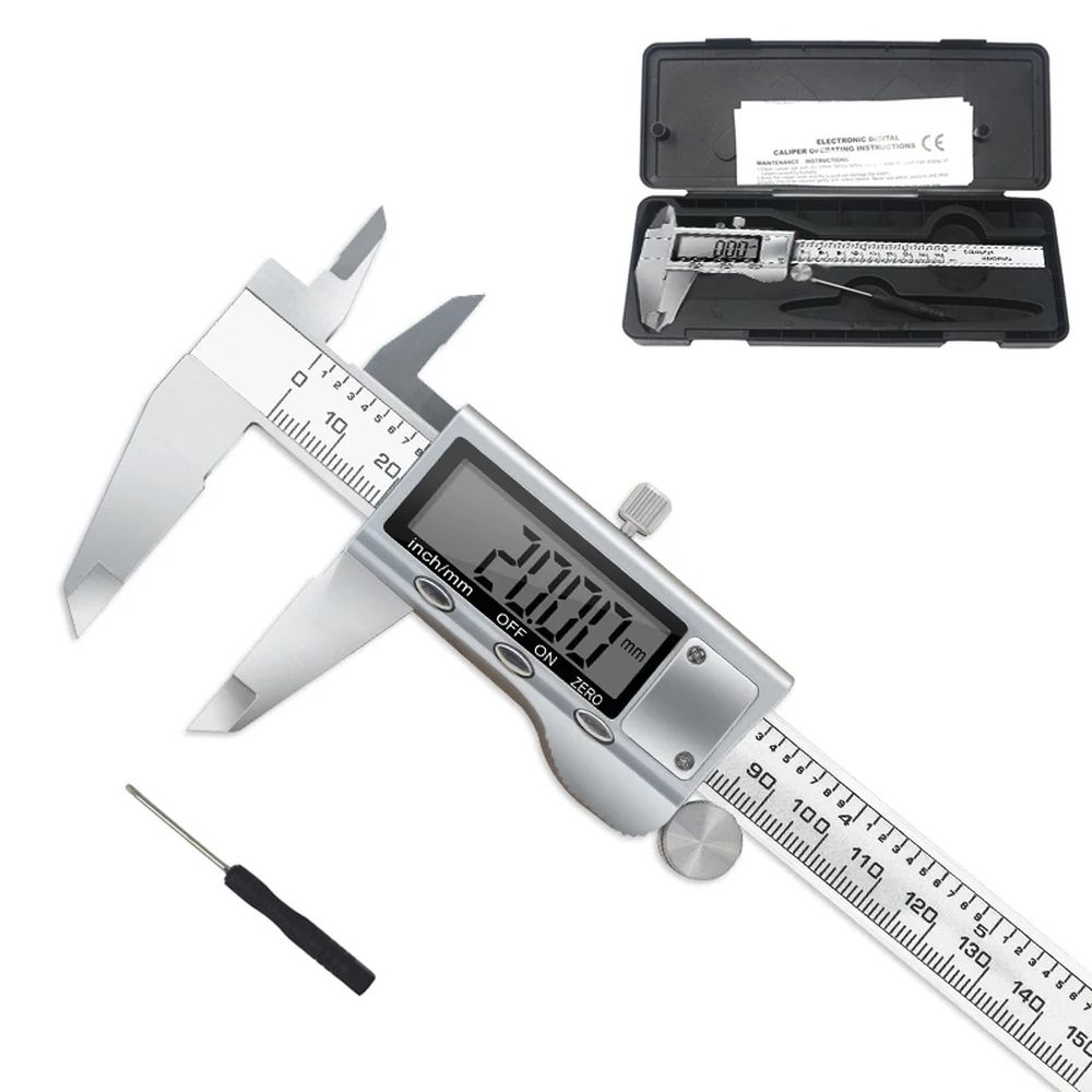 Востребованным инструментом для ручного измерения линейных размеров также является и штангенциркуль. Современные модели оснащены цифровым дисплеем с возможностью отображения пяти разрядов. Диапазон измерений составляет от 0 до 150мм. Точность замеров очень высокая, также есть возможность сброса на ноль и переключения единиц измерения. Выполнен из нержавеющей стали (существенно превосходит пластиковые модели). Советую брать именно подобный, т.к. более дешевый вариант, в котором направляющая выполнена из пластика, хуже по точности измерений и менее надежен. Стоит выбрать вариант в пластиковом кейсе.