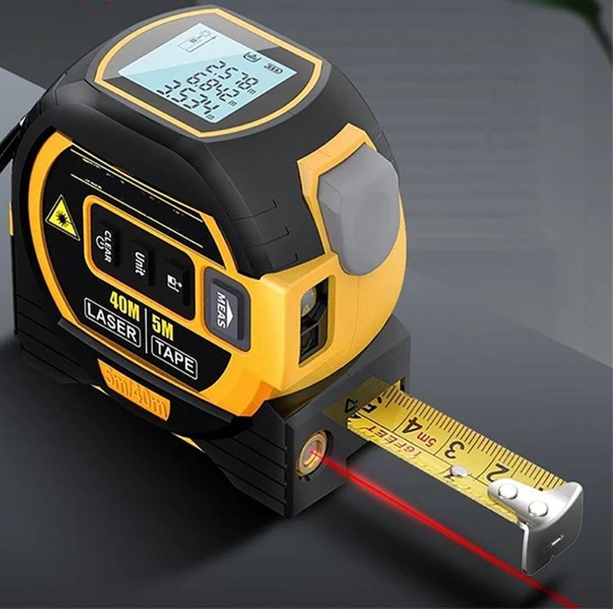 Каждый мастер знает, что самым популярным измерительным инструментом является рулетка. Но что если совместить обычную рулетку с лазерной, получим еще более универсальный инструмент, с возможностью измерения достаточно больших расстояний. В данной рулетке именно такая возможность и совмещена. Обычное полотно рулетки может проводить замер до 5 метров, а вот лазер дает возможность делать замеры от 40 до 60 метров (в зависимости от выбранного варианта). Кроме этого инструмент может выступать и в качестве небольшого лазерного уровня с проецированием луча на стену. Влагозащищенный корпус, питание от двух батареек АА.
