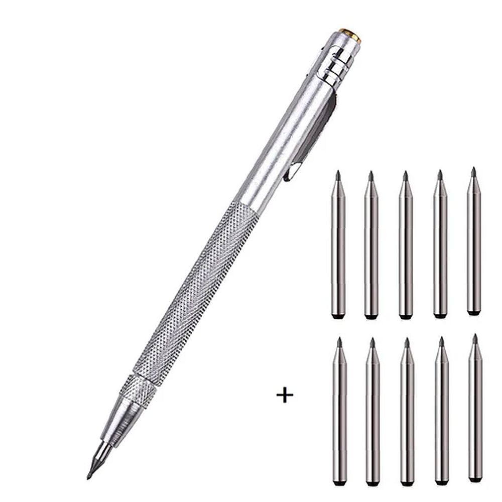 Если требуется провести размету по металлу, керамике или другому подобному материалу не всегда подойдет грифельный карандаш. Для таких работ лучшим вариантом будет специальная ручка-чертилка наконечник которого выполнен из карбида вольфрама. Данный материал имеет чрезвычайно высокую прочность и твердость, поэтому способен оставлять четкие и хорошо заметные бороздки н твердых материалах таких как: металл, стекло или керамическая плитка. На странице товара можно выбрать вариант с дополнительным комплектом сменных наконечников.