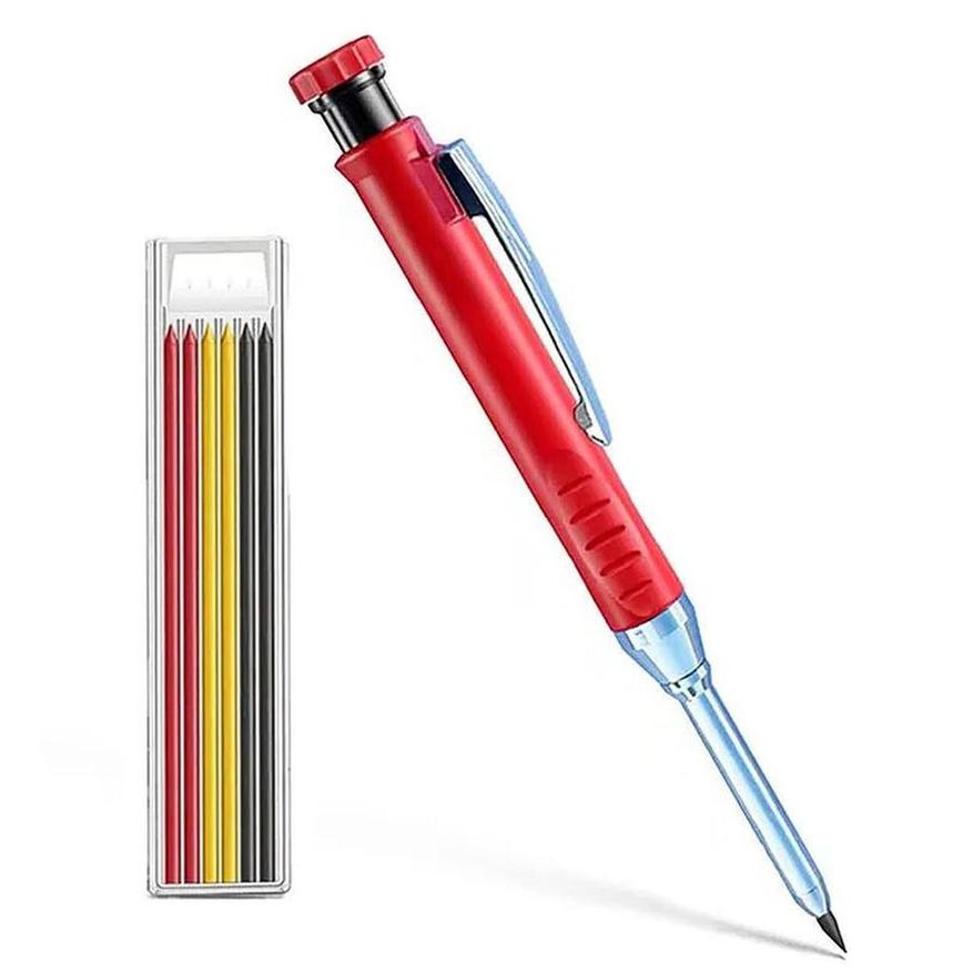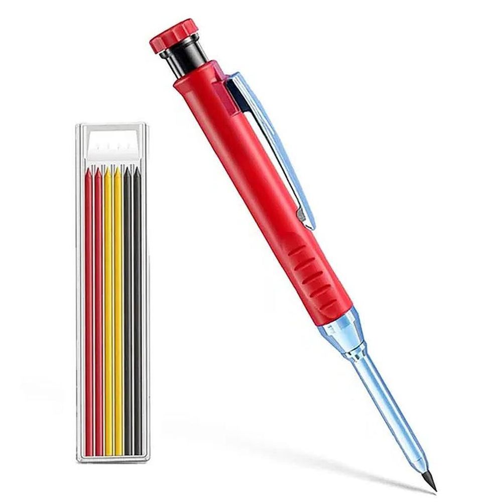 Начну с карандашей. Не побоюсь утверждать, что считаю данный вариант разметочного карандаша лучшим для столярных и прочих разметочных работ. Основа выполнена из металла (сверху пластиковый корпус) и полностью защищает грифель поломки при падении и случайных ударах, которые часто случаются при проведении работ. Графитовый стержень имеет диаметр 2.8мм и длину 120мм, находится внутри прочной металлической трубки и легко заменяется, хотя и хватает на длительную работу. В кнопку карандаша выдвигающую стержень встроена маленькая точилка для постоянного поддержания остроты грифеля. Карандаш можно заказать как отдельно, так и в комплекте с шестью стержнями стержней (твердость 2B) черного, красного и желтого цветов.