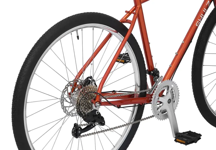Если говорить о комплите Wanderer, то наблюдаем двойник 46+30T при 9-скоростной кассете microSHIFT CS-H092 11-36. Отличный диапазон, определенно. Манетки — торцевые переключатели microSHIFT BS-A09, штука очень неоднозначная. Shulz объясняет их наличие примитивной конструкцией и возможностью починить «на коленке» в случае каких-то проблем, например после падения. Промподшипники присутствуют во втулках, каретке и рулевой — как и принято во всех велосипедах бренда.