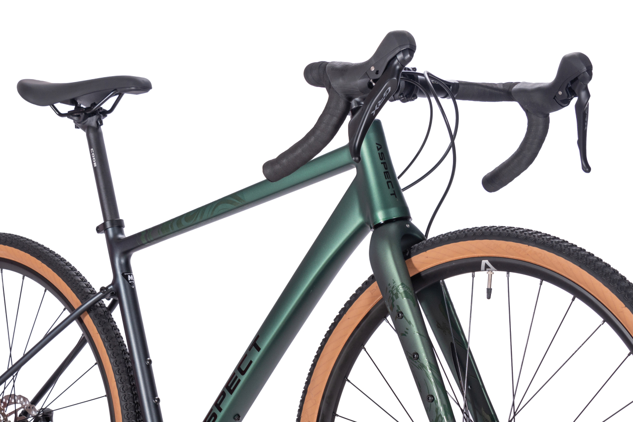 Основное отличие более дорогих моделей от таковых в районе 100 000 руб — наличие гидравлических тормозов и повсеместное использование гравийного групсета с миксом 400-600-800 серий Shimano GRX. И вопрос стоит чаще в том, кто ставит компоненты GRX попроще, а кто — нет. Или в какой пропорции занимается этим увлекательным конструктором. Конкретно у Aspect Allroad Elite присутствует приличный микс на 11 скоростей из заднего переключателя Shimano GRX RD-RX812, манетки ST-RX600 и тормозов BR-RX400. Для снижения цены обошлись кассетой попроще, вместо Shimano — SunShine CS-HR11-42L. Система представлена PROWHEEL RPP-FD16S-TT с 40T звездой. Установлены покрышки CST Pika 700х42c с довольно зубастым протектором — явно для тех, у кого колеса касаются грунтовок чаще, чем асфальта.