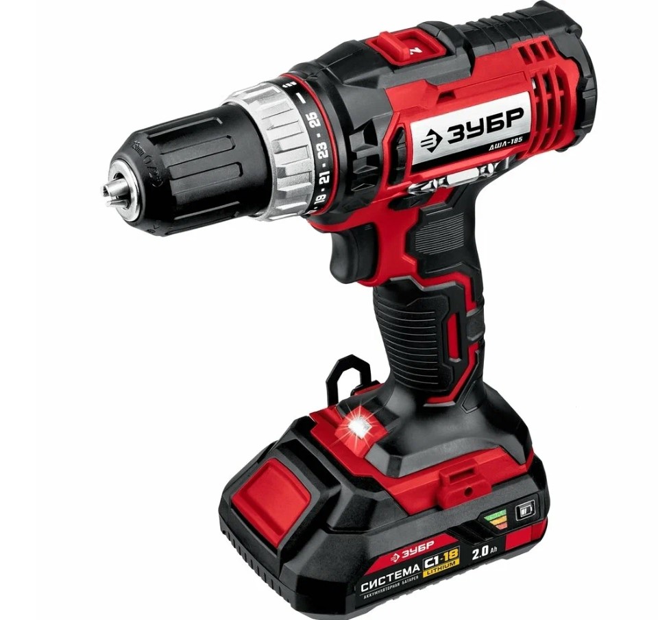 Существует еще один из вариантов, на него тоже можно обратить внимание — это «красный» ЗУБР. В частности, мощный шуруповерт с функцией дрели и аккумуляторным питанием в версии комплектации ДШЛ-185-22 представляет собой достаточно мощное устройство. Отмечу патрон, который можно зажать или открутить одной рукой, а также с муфту на 23 позиции. По заявлению производителя момент у этой дрели составляет 40 Нм. Поставляется «красный» ЗУБР в оригинальном жестком кейсе, внутри которого находится сетевое з/у, а также сразу две аккумуляторные батареи с номинальной ёмкостью 2.0 Ампер-часа.