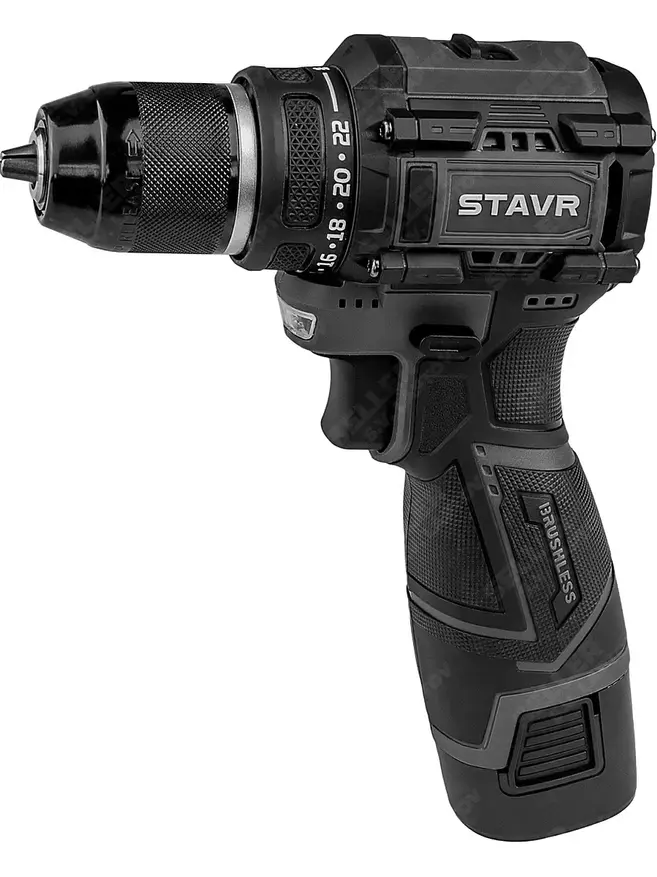 STAVR SDD 16BL-2K — оптимален для дома, сборки мебели и дачи за счёт своих габаритов (144*61*207 мм, вес 1.2кг). Цена — от 5 597 ₽. В комплект входит сам шуруповёрт, пластиковый кейс, 2 АКБ и зарядное устройство. Отличный баланс мощности, комплектации и гарантии делает STAVR SDD 16BL-2K привлекательным для регулярного использования: закручивание крепежа, сверление дерева (до 42 мм), металла (до 10-12 мм) и пластика. Данный шуруповёрт оснащён бесщёточным двигателем (BL) с крутящим моментом 34 Н*м (23 ступени регулировки + свободное вращение). Редуктор двухскоростной: 0-400 об/мин (закручивание) и 0-1450/1600 об/мин (сверление). Что касается питания, то это Li-Ion аккумуляторы с напряжением 16 В. В комплекте сразу два АКБ с ёмкостью 2 А*ч каждый.