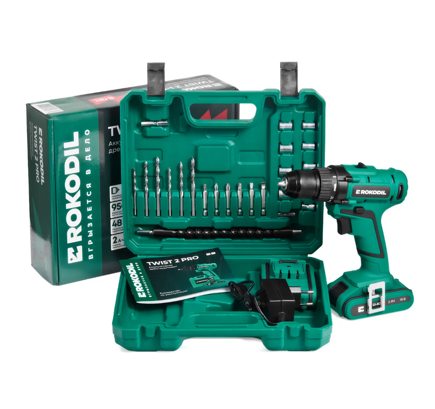 Ещё один вариант от Rokodil, модель Twist 2 Pro — аккумуляторная дрель-шуруповёрт для бытовых и полупрофессиональных задач: сверление дерева (до 36 мм), металла (до 13 мм), пластика и работа с крепежом. Модель выделяется более высоким крутящим моментом (48 Н*м, схема 18+1) по сравнению с Air, расширенной комплектацией и также 5-летней гарантией. Rokodil Twist 2 Pro оснащён щёточным двигателем (модель RS550VC), быстрозажимным патроном на 10 мм и двухскоростным редуктором (0-400 об/мин для закручивания и 0-1400 об/мин для сверления). Алюминиево-нейлоновый корпус обеспечит долгую жизнь инструменту.