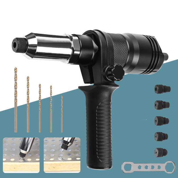 В комплекте: адаптер для заклепочного пистолета, боковая рукоятка, гаечный ключ, 5 сменных головок для заклепок (2.4 мм, 3.2 мм, 4.0 мм, 4.8 мм, 6.4 мм), 5 сверл (2.4/3.2/4.0/4.8/6.4 мм).