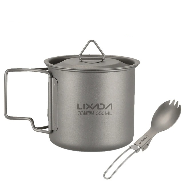 На выбор есть кружки (300-750 мл, весом 75-121 г, в большие помещается газовый баллон), изготовленные из титанового сплава, и складные вилки-ложки с ручкой из нержавеющей стали.
